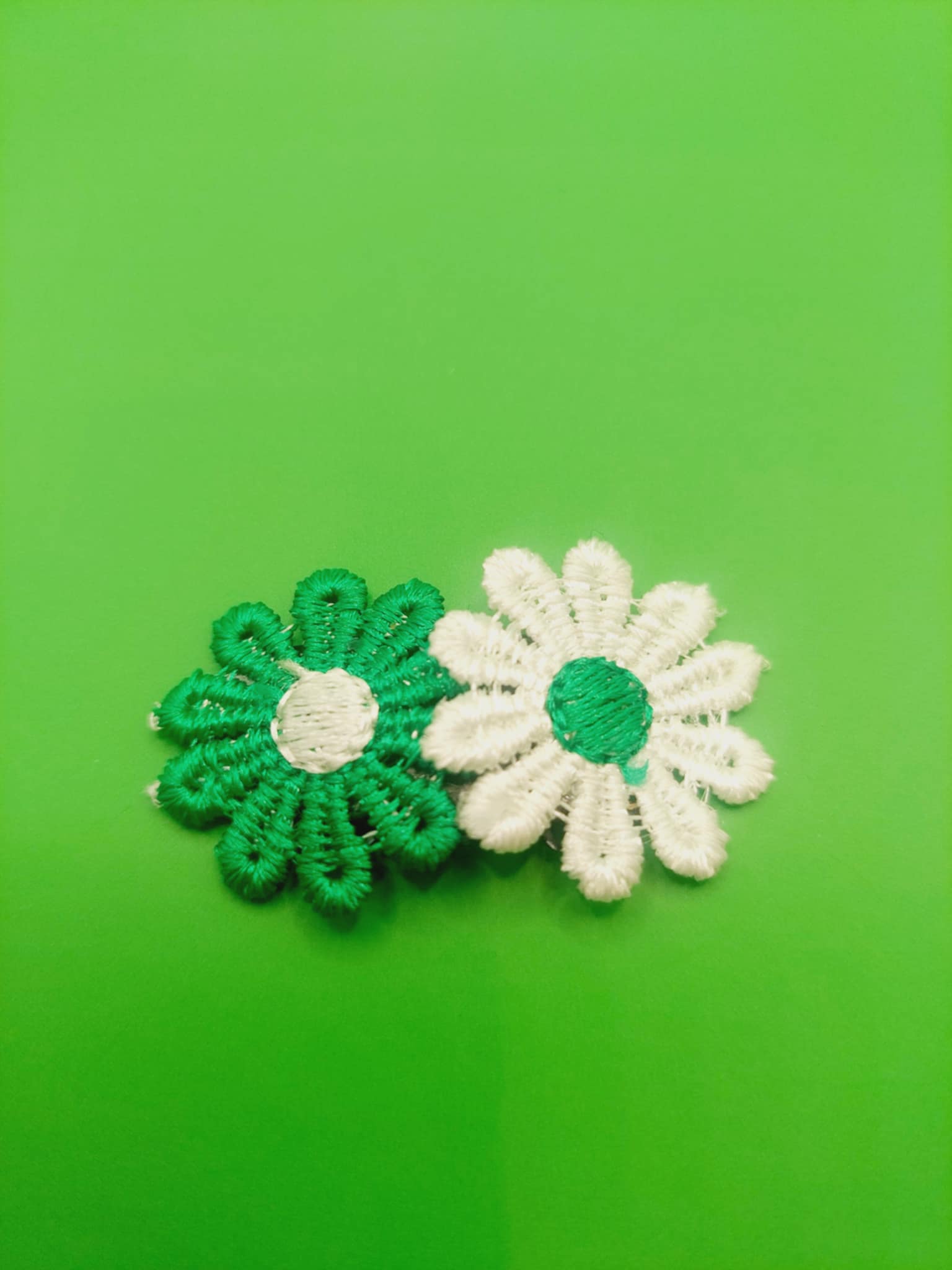 Aan de zicht zijde zitten 2 stoffen bloemmetjes. Aan de onderzijde zit een 3,2 cm antislip Haarklemmetje.Deze klik je open , schuif je in de haren en vervolgens klik je hem dicht, Door het rubber laagje klemt hij zich stevig vast. De stof is vast gemaakt met textiel lijm deze kan goed tegen water en vocht.