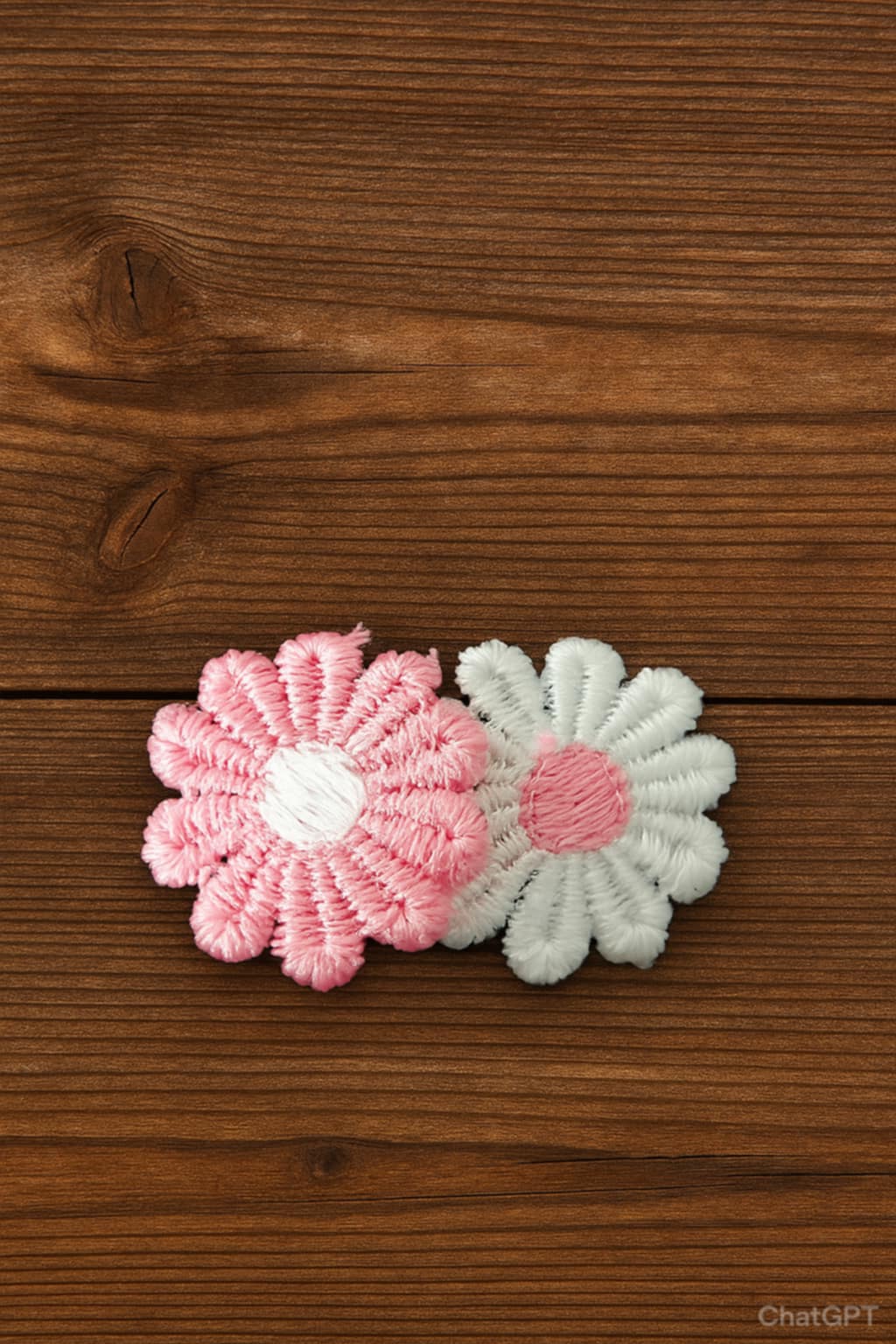Aan de zicht zijde zitten 2 stoffen bloemmetjes. Aan de onderzijde zit een 3,2 cm antislip Haarklemmetje.Deze klik je open , schuif je in de haren en vervolgens klik je hem dicht, Door het rubber laagje klemt hij zich stevig vast. De stof is vast gemaakt met textiel lijm deze kan goed tegen water en vocht.