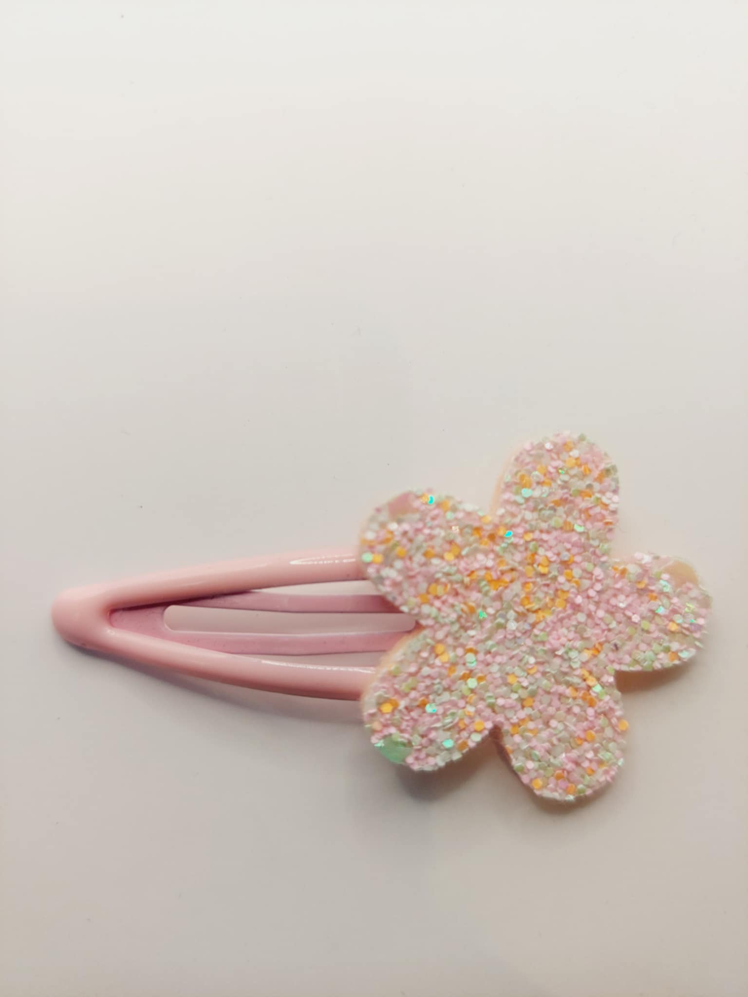 Haarclip met een rubber coating met een licht roze bloem met glitter