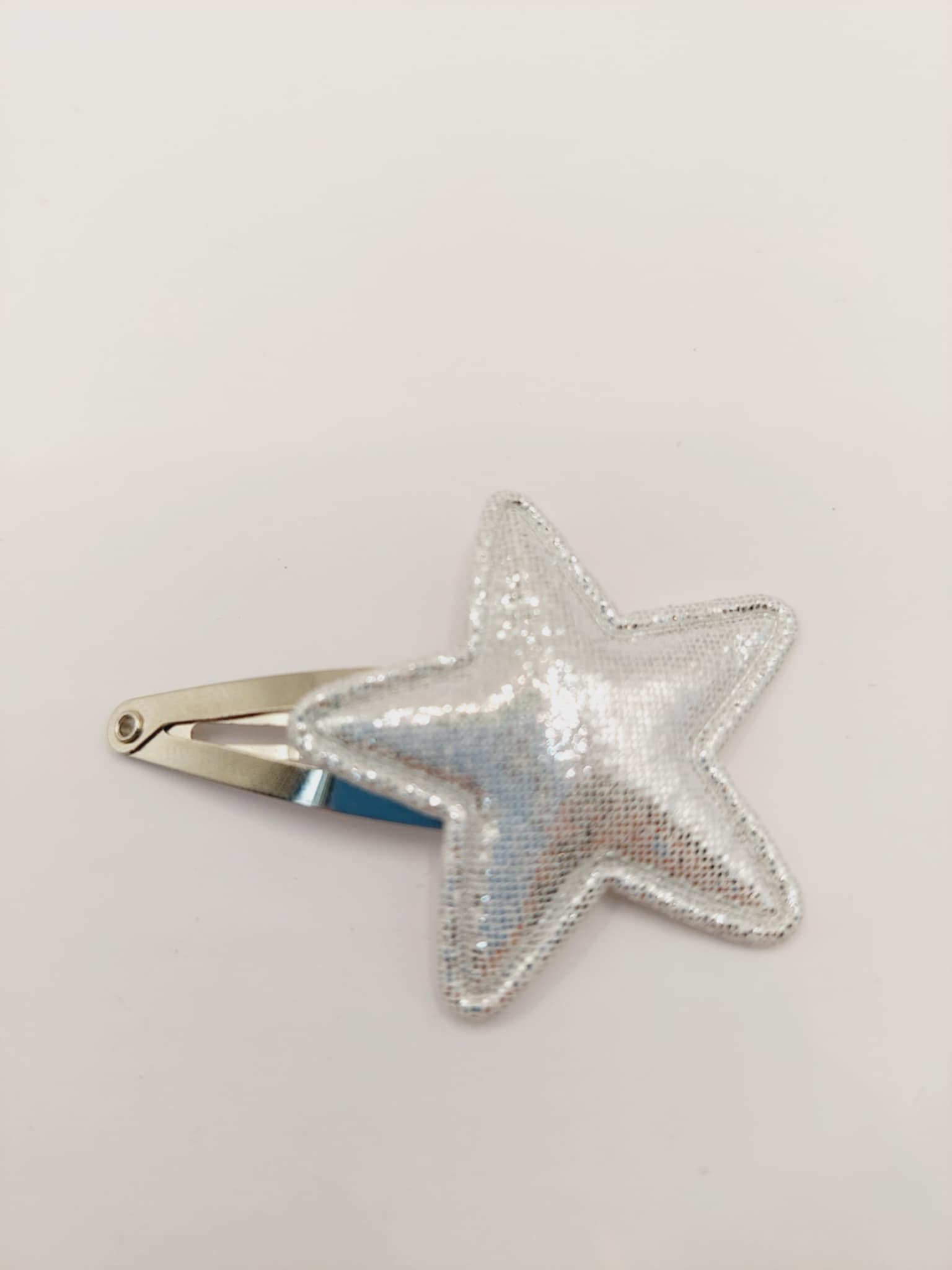 Aan de achterzijde zit een 4 cm zilveren clip en de voorzijde een stoffen ster