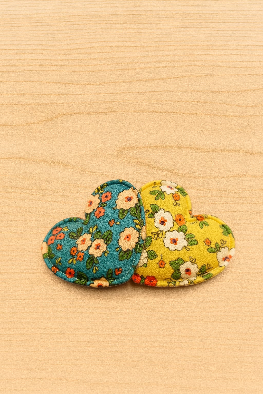 Aan de zicht zijde zitten 2 stoffen hartjes. Aan de onderzijde zit een 3,2 cm antislip Haarklemmetje.Deze klik je open , schuif je in de haren en vervolgens klik je hem dicht, Door het rubber laagje klemt hij zich stevig vast. De stof is vast gemaakt met textiel lijm deze kan goed tegen water en vocht.
