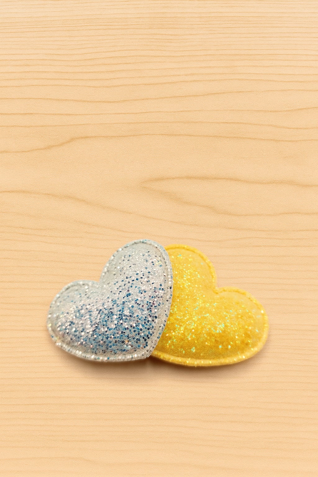 Aan de zicht zijde zitten 2 stoffen hartjes. Aan de onderzijde zit een 3,2 cm antislip Haarklemmetje.Deze klik je open , schuif je in de haren en vervolgens klik je hem dicht, Door het rubber laagje klemt hij zich stevig vast. De stof is vast gemaakt met textiel lijm deze kan goed tegen water en vocht.
